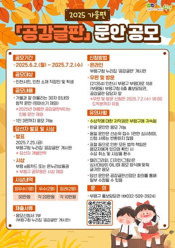 부평구(구청장 차준택)가 오는 2일부터 다음달 2일까지 한 달간 '2025년 가을편 공감글판' 문안을 공모한다.