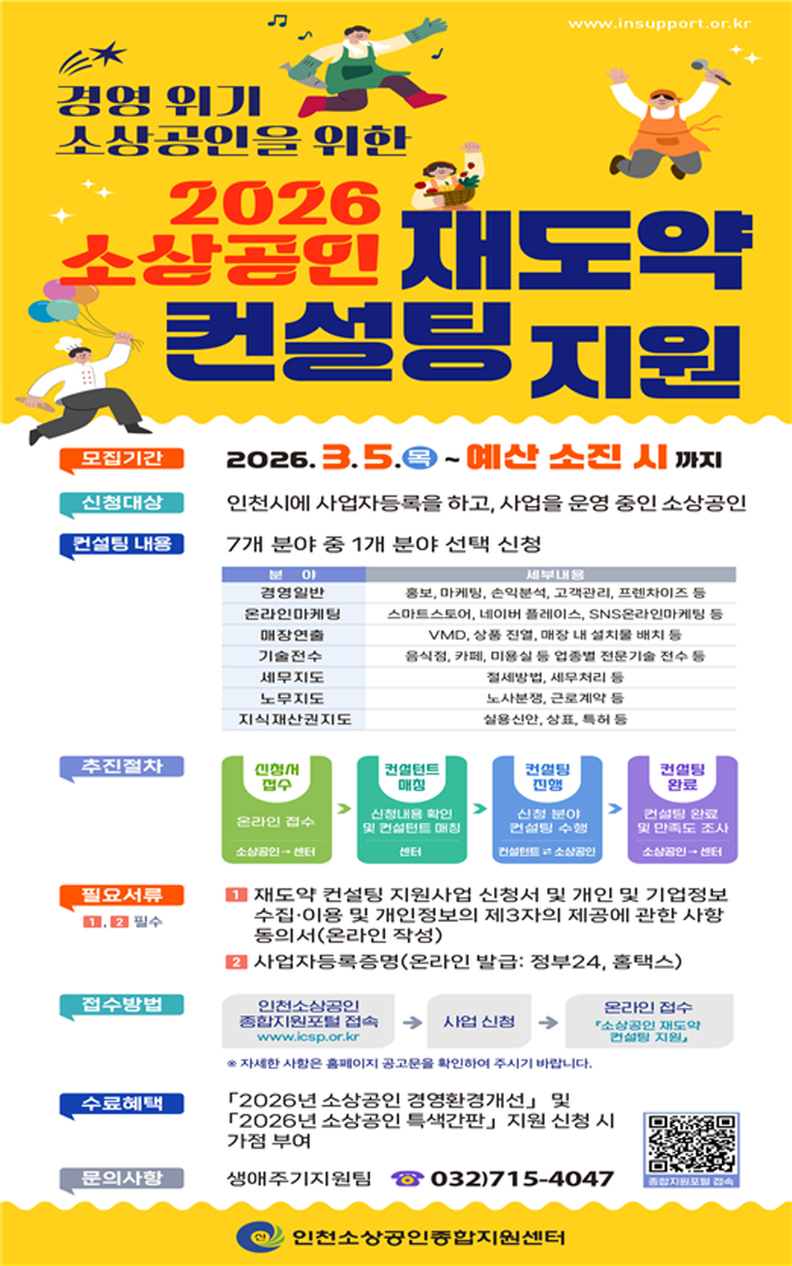 인천광역시(시장 유정복)는 오는 3월 5일부터 인천지역 소상공인을 대상으로 경영위기 극복 및 영업 활성화를 위한 소상공인 재도약 컨설팅 지원사업을 본격 추진한다고 밝혔다.