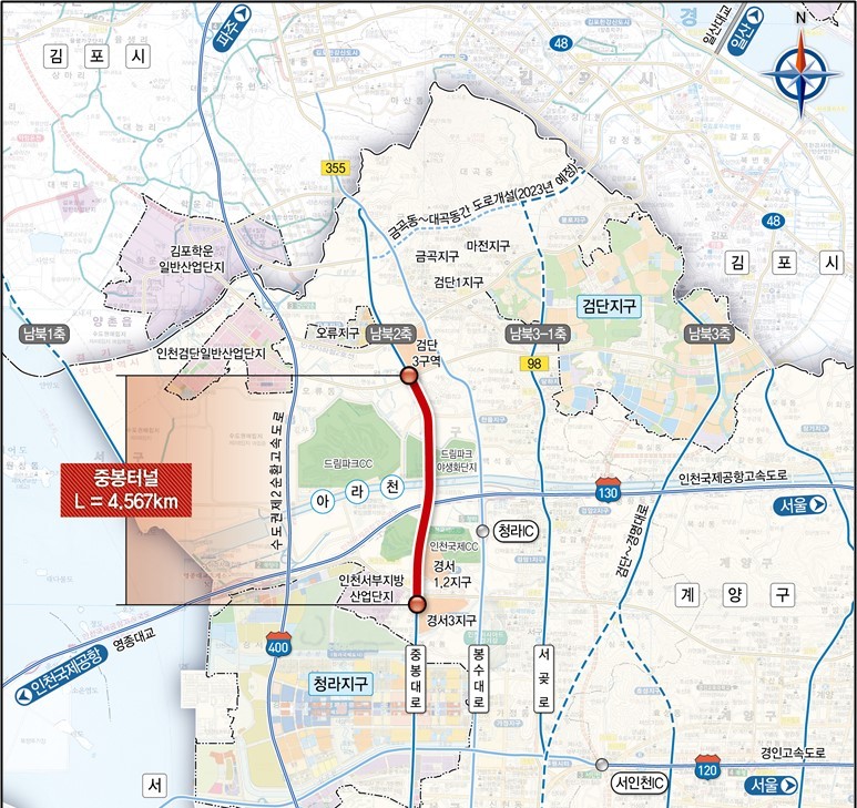 중봉터널 건설사업은 남북 2축 중 단절된 중봉대로(서구 경서동과 왕길동 구간)를 연결하는 총연장 4.57km, 왕복 4차로 규모의 민간투자사업으로 국비 512억 원이 투입되며 봉수대로와 서곶로 일대의 교통혼잡을 완화할 것으로 기대된다.