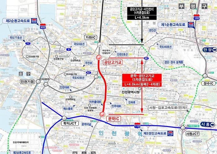 문학IC∼공단고가교 도로 건설사업은 총연장 4.0km, 왕복 4차로 규모로 추진되며, 국비 2,031억 원이 투입되어 공단고가교∼서인천IC 혼잡도로와 연계된 도심 남북축 간선도로망을 구축해 장거리 교통수요를 분산시키고 도심 내부 교통혼잡을 크게 완화할 것으로 기대된다.